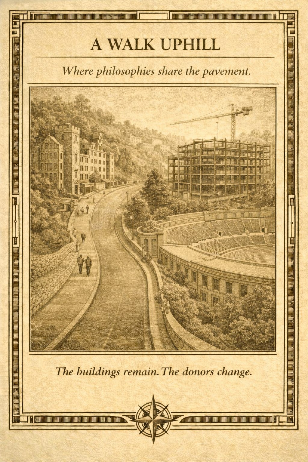 Walk up Gayley Road now and you can feel these philosophies sharing a narrow stretch of pavement. Bowles Hall continues to loom with medieval composure. The Greek Theatre continues to host concerts without consulting any donor’s editorial preferences. Across the street, new construction advances in phases funded by modern campaigns, global capital, and institutional borrowing.