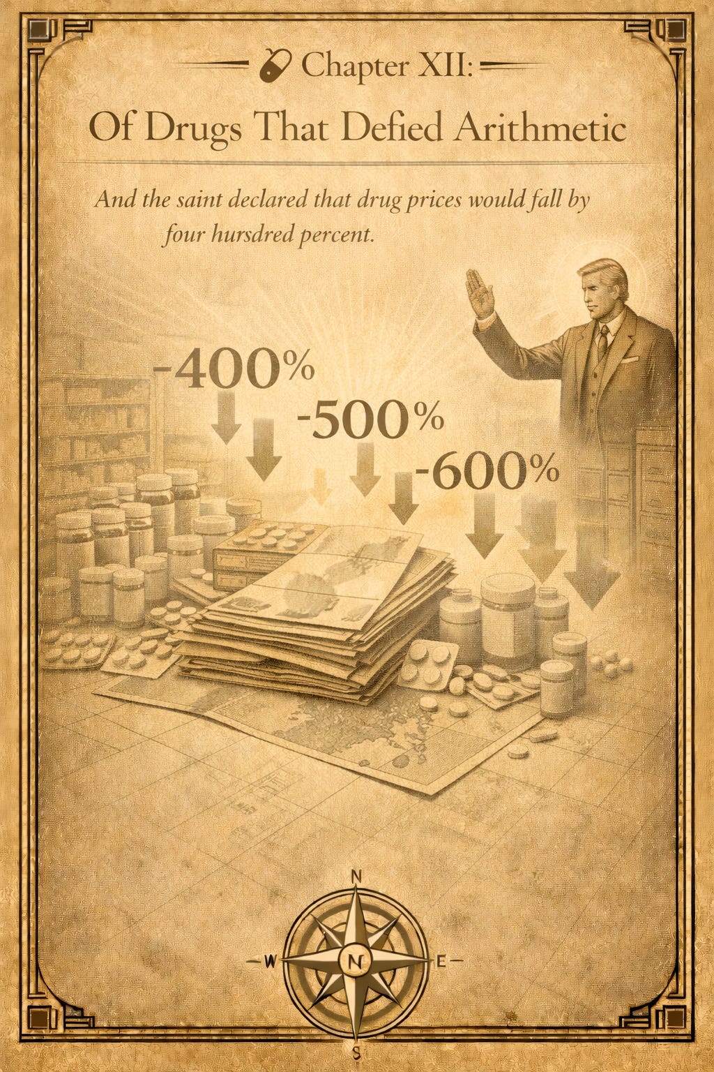 And the saint declared that drug prices would fall by four hundred percent. Then five hundred. Then six hundred.
