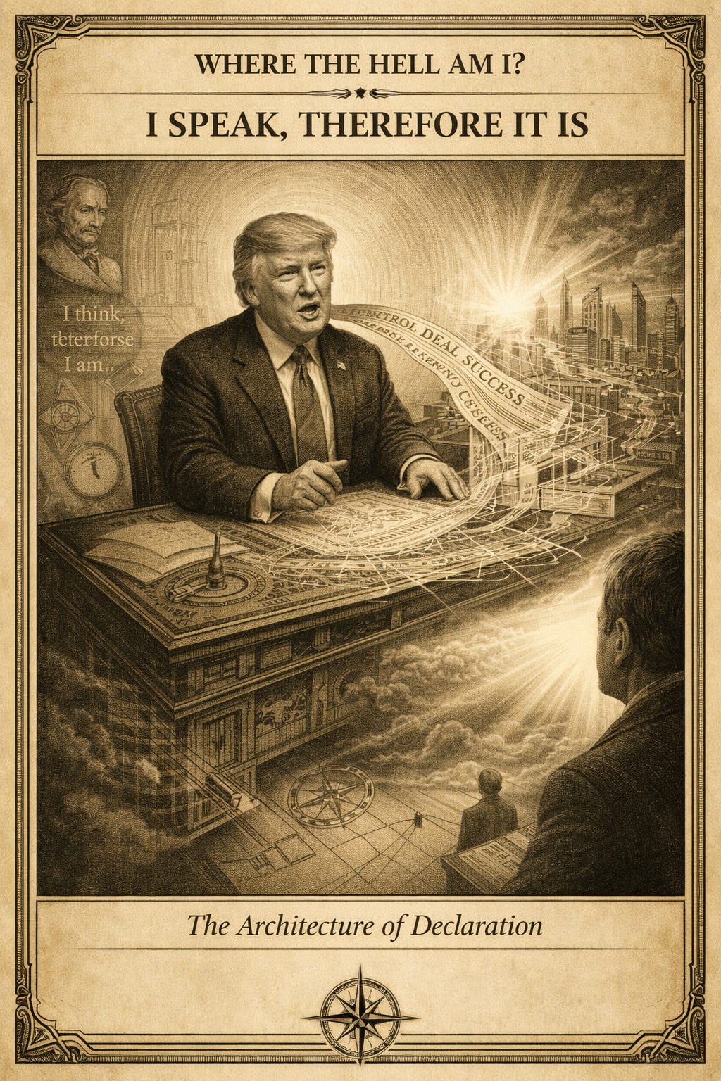 He moves with the logic of impulse. One declaration arrives before the last has had time to prove itself true, false, or something in between. He speaks not like a man describing reality, but like a man attempting to author it in real time.
