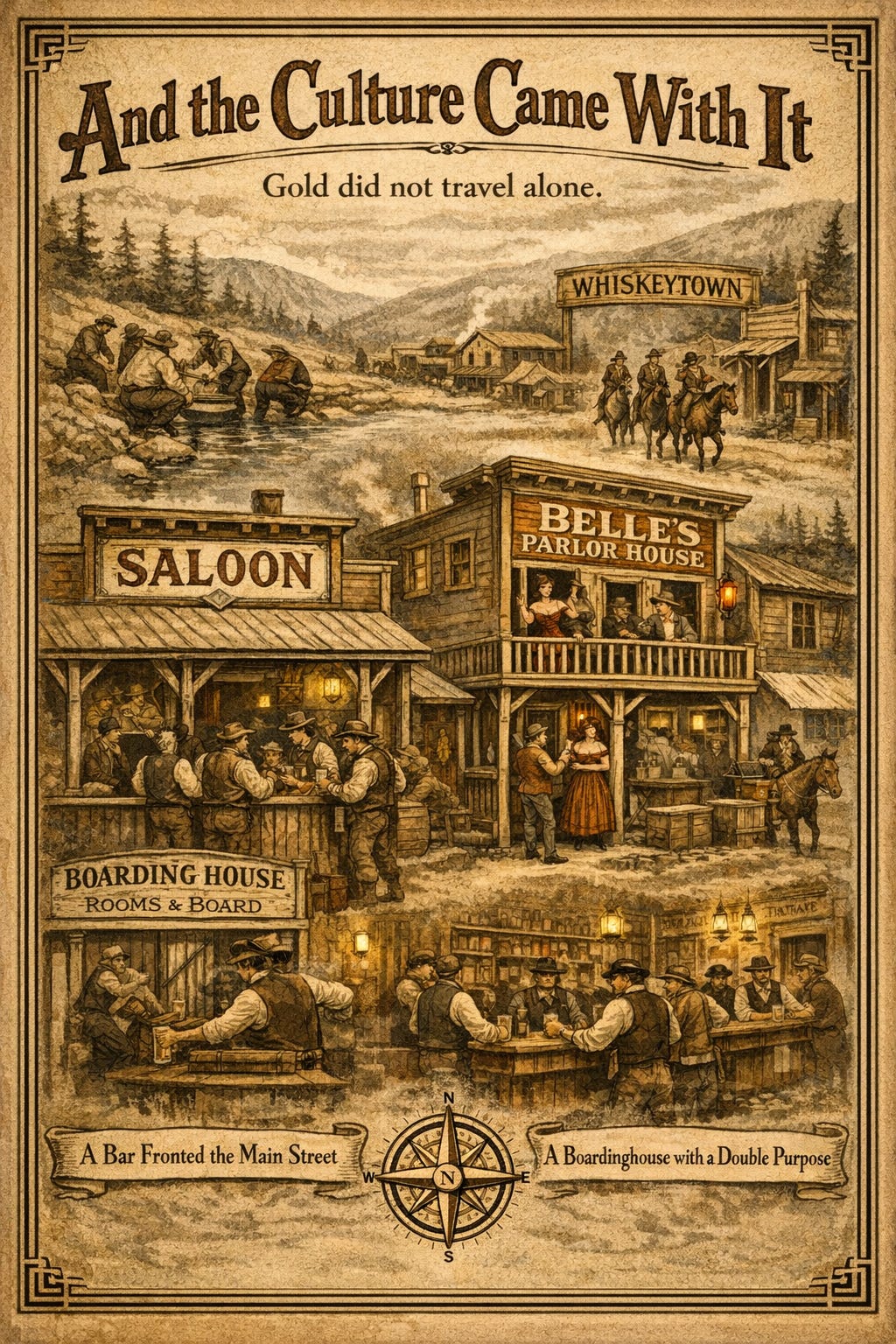 By the time the diggings pushed north toward Whiskeytown and beyond, the social architecture of the Gold Rush had already formed its habits. A town might begin with tents and pans, but it did not feel complete until: