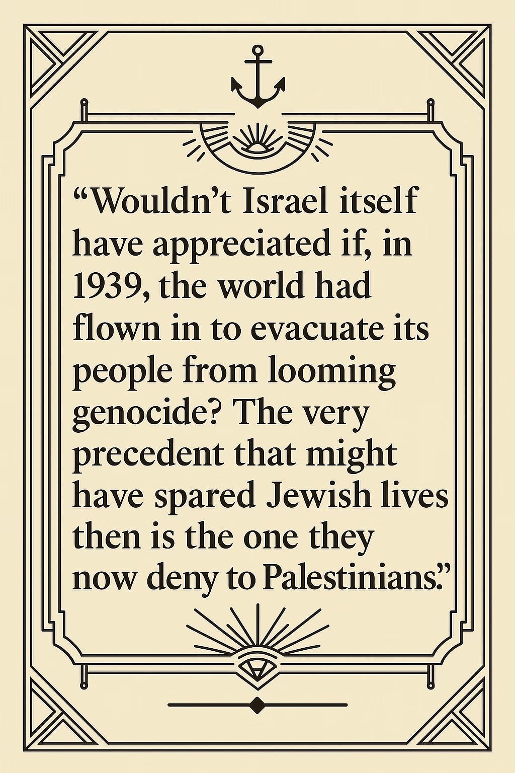 âWouldnât Israel itself have appreciated if, in 1939, the world had flown in to evacuate its people from looming genocide? The very precedent that might have spared Jewish lives then is the one they now deny to Palestinians.â