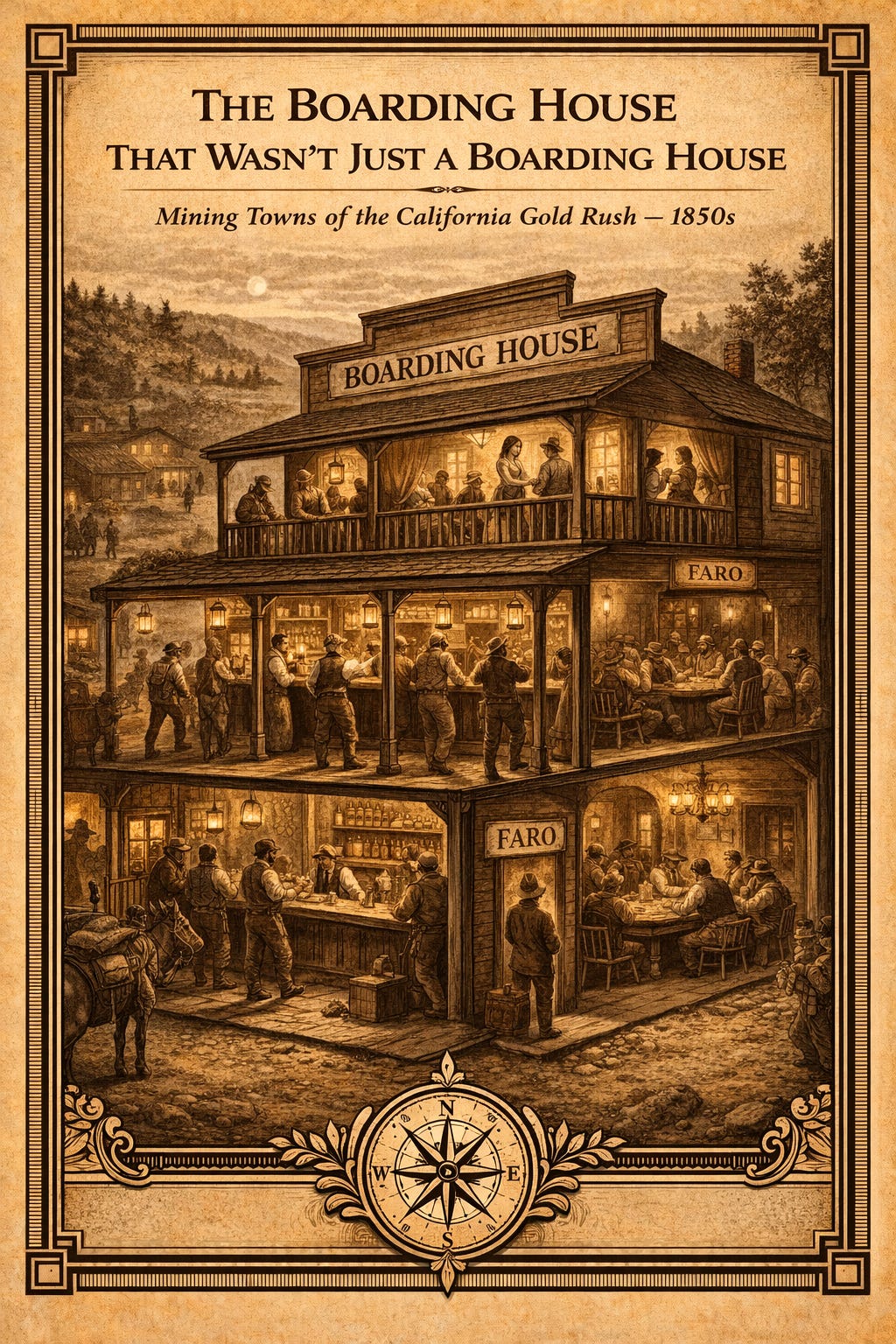 The California Gold Rush was never just a tale of solitary prospectors chasing nuggets in the river. It was a world of crowded towns, restless gamblers, multilingual dance halls, and boarding houses whose upstairs rooms kept the entire frontier economy humming.