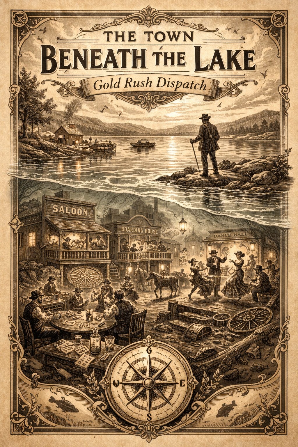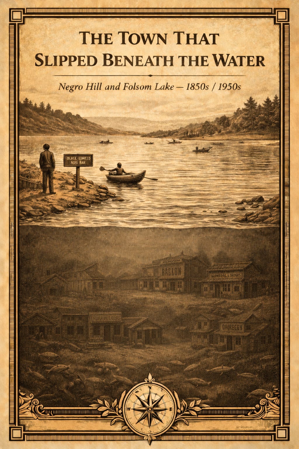 Stand on the shore of Folsom Lake on a quiet morning and look across the water. Beneath that calm blue surface once stood a small, noisy Gold Rush town where miners argued over cards, fiddles played in dance halls, and whiskey glasses clinked long after sunset.