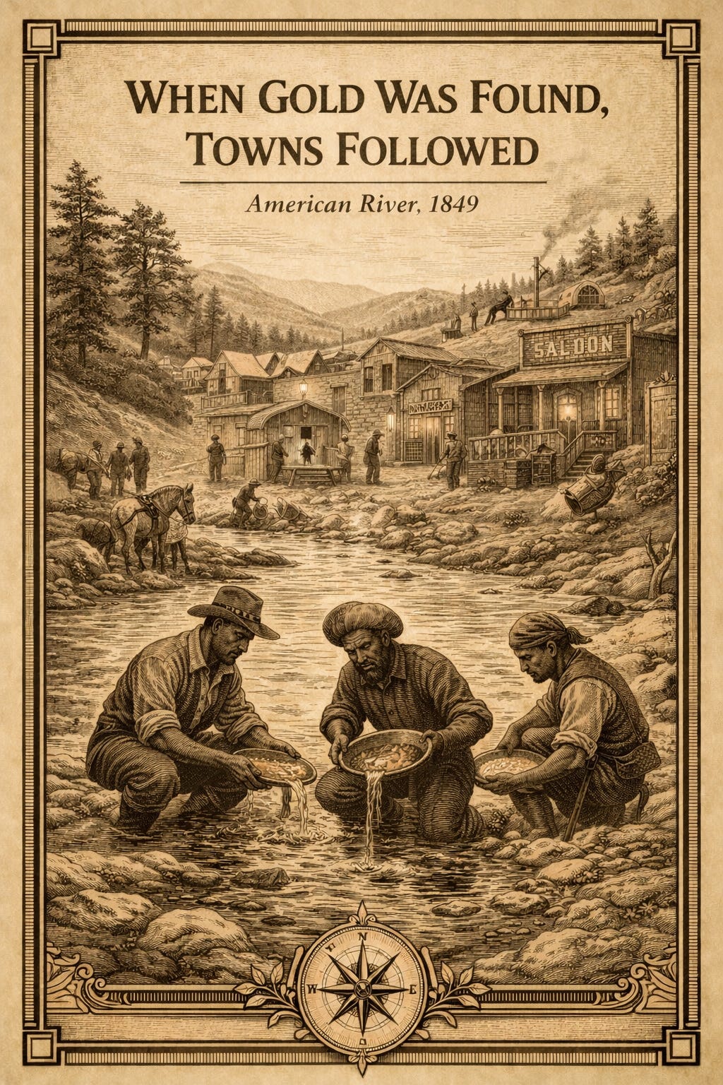 Gold Rush towns did not require permission to exist. They simply appeared wherever a few lucky pans convinced people to stay.