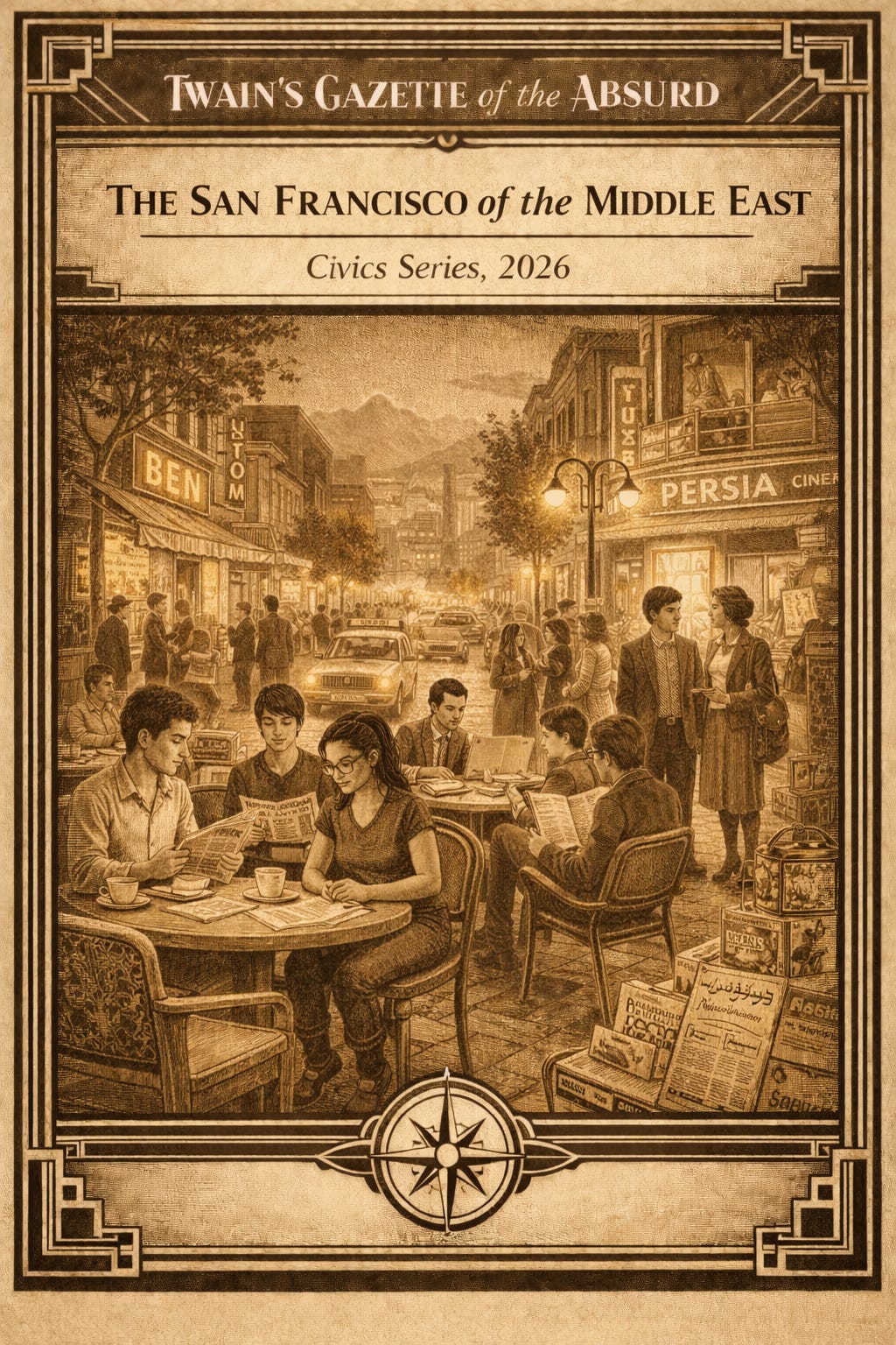 And on warm nights the city glowed: music spilling from cabarets along Laleh-Zar, headlights sliding past rows of plane trees on Pahlavi Street, students lingering in cafés while the snow-capped Alborz Mountains hovered in the distance like a painted backdrop to a film about a country convinced the future had already arrived.
